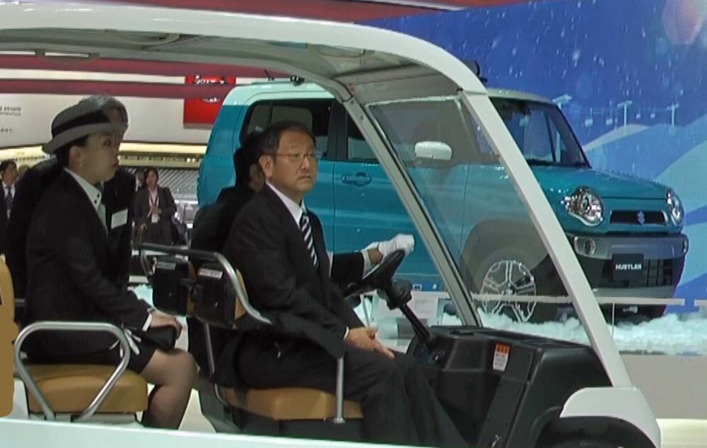 東京モーターショー総裁の三笠宮瑶子女王殿下を案内する豊田自工会会長
