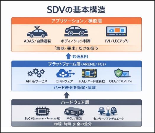 プラットフォーム層(SDV基盤)は、・API/サービス定義 、・ミドルウェア(通信・同期)、・HAL(Hardware Abstraction)、・OTA/ログ/セキュリティ 、