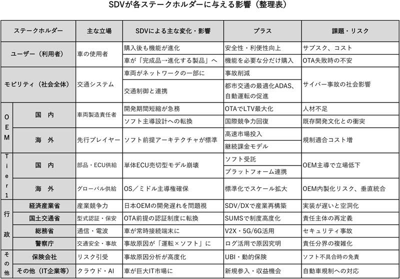 クルマがSDV化することによって各ステークホルダーにすでに大きな影響を与えつつある。想定される影響につき、ステークホルダーをユーザー、モビリティ(都市交通)、OEM,Tier1、行政等に区分し、それぞれの立場と予想される変化・プラスとリスクを表にまとめた。
