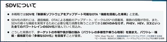 先に紹介した「モビリティDX戦略」では、SDVとは「クラウドとの通信を用いて、自動車の機能を継続的にアップデートできる(OTA)次世代車両」と定義している。従来「百家迷走」状態で一言で表せないSDVの定義を、高田教授をはじめこの分野のプロが議論の末、端的に定義したもので分かりやすい。
