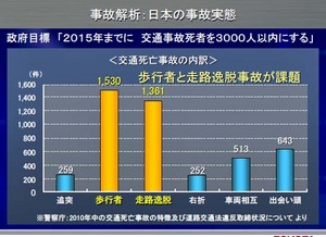 日本では2010年中の交通事故による死亡者は、4,863人と10年連続の減少となり、10年前に比べるとほぼ半減したが、死者数を状態別にみると、2年前から歩行中(構成率35.2%)が最も多く、次いで自動車乗車中(同32.9%)となっている。さらに交通死亡者の特徴を見ると、高齢者(65歳以上)が過半数(同50.4%)を占め、また、夜間の死亡事故も半数近く(同49.3%)を占めている