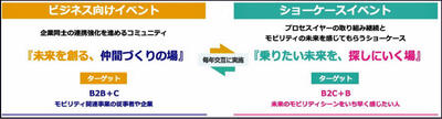 主催の自工会では、昨年、隔年開催であったJAPAN MOBILITY SHOWを毎年開催すると宣言していた。その形として、「2年のイベントを1つのパッケージ」とする。具体的には、企業連携を推進する「プロセスイヤー」を『未来を創る、仲間づくりの場』としてのビジネスイベント(BtoB)、翌年の「ショーイヤー」は『乗りたい未来を、探しにいく場』として、多くのお客様にモビリティの未来を感じていただくためのショーケース(BtoC)。これらをパッケージとして開催する。」と解説している。